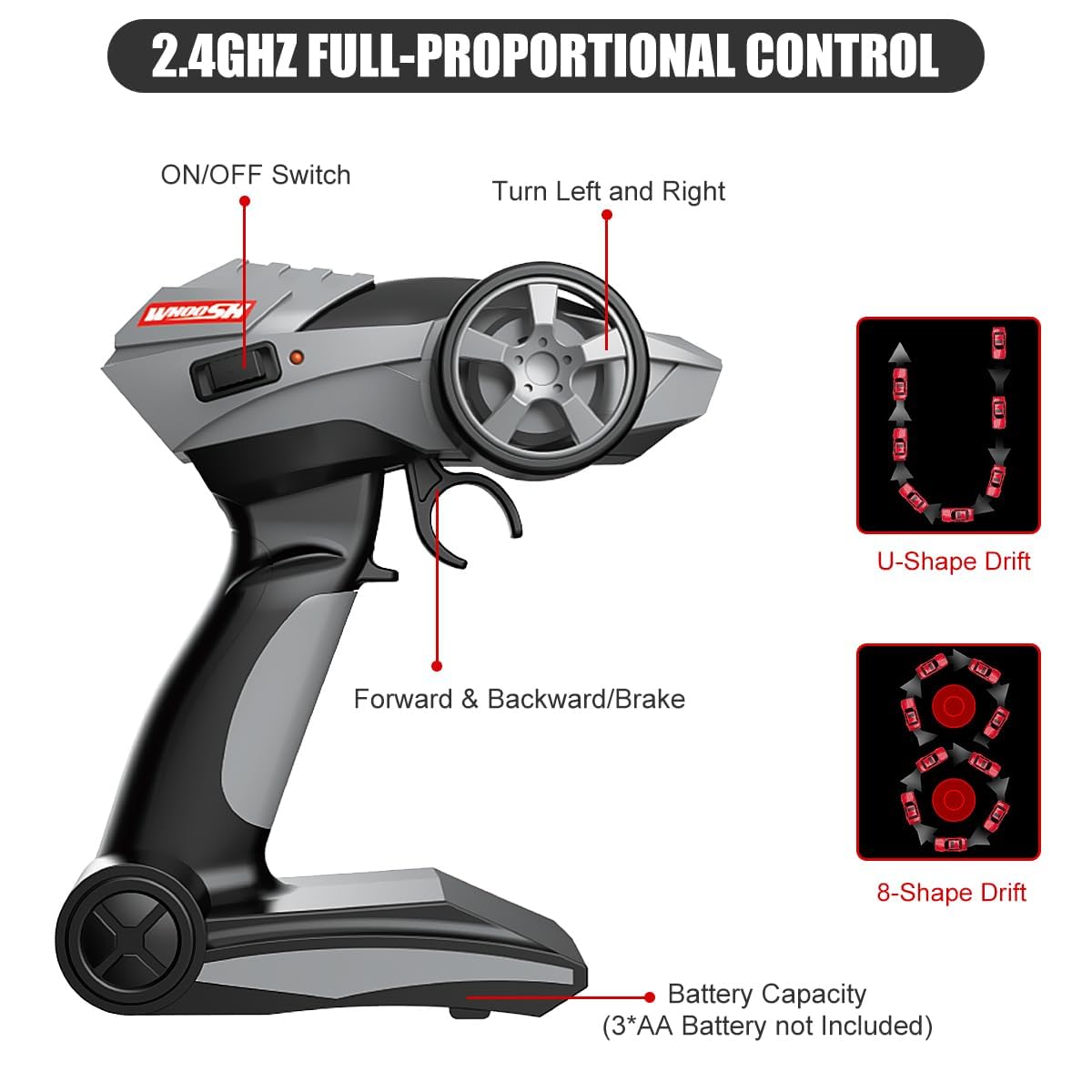 Powerful 4WD motor, LED lights, drift tyres & full-proportional control for realistic racing.