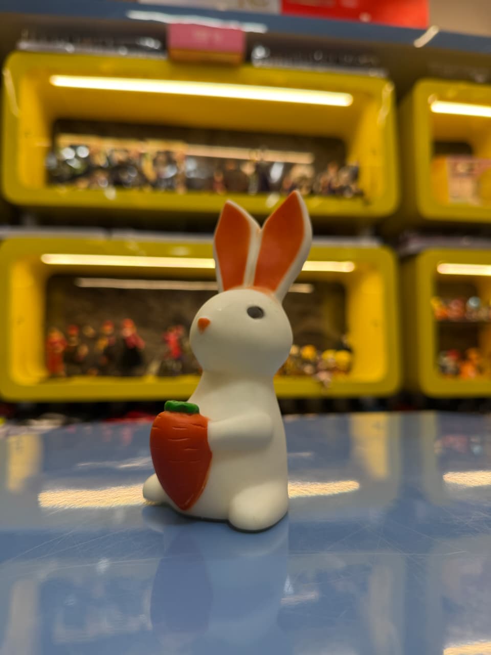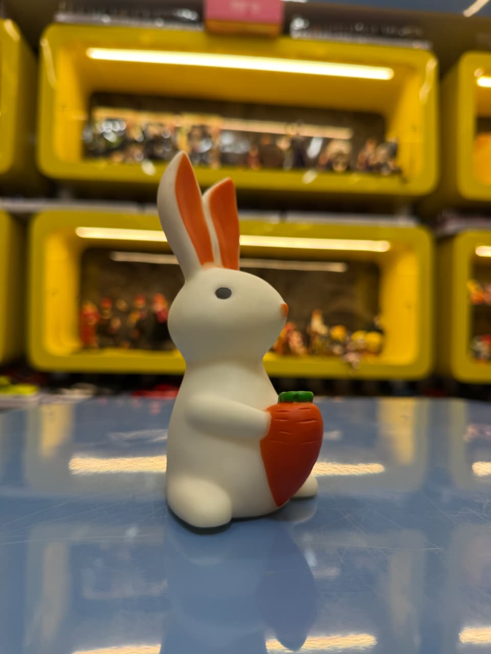 Adorable carrot-holding bunny night lamp with soft silicone body and warm LED glow.