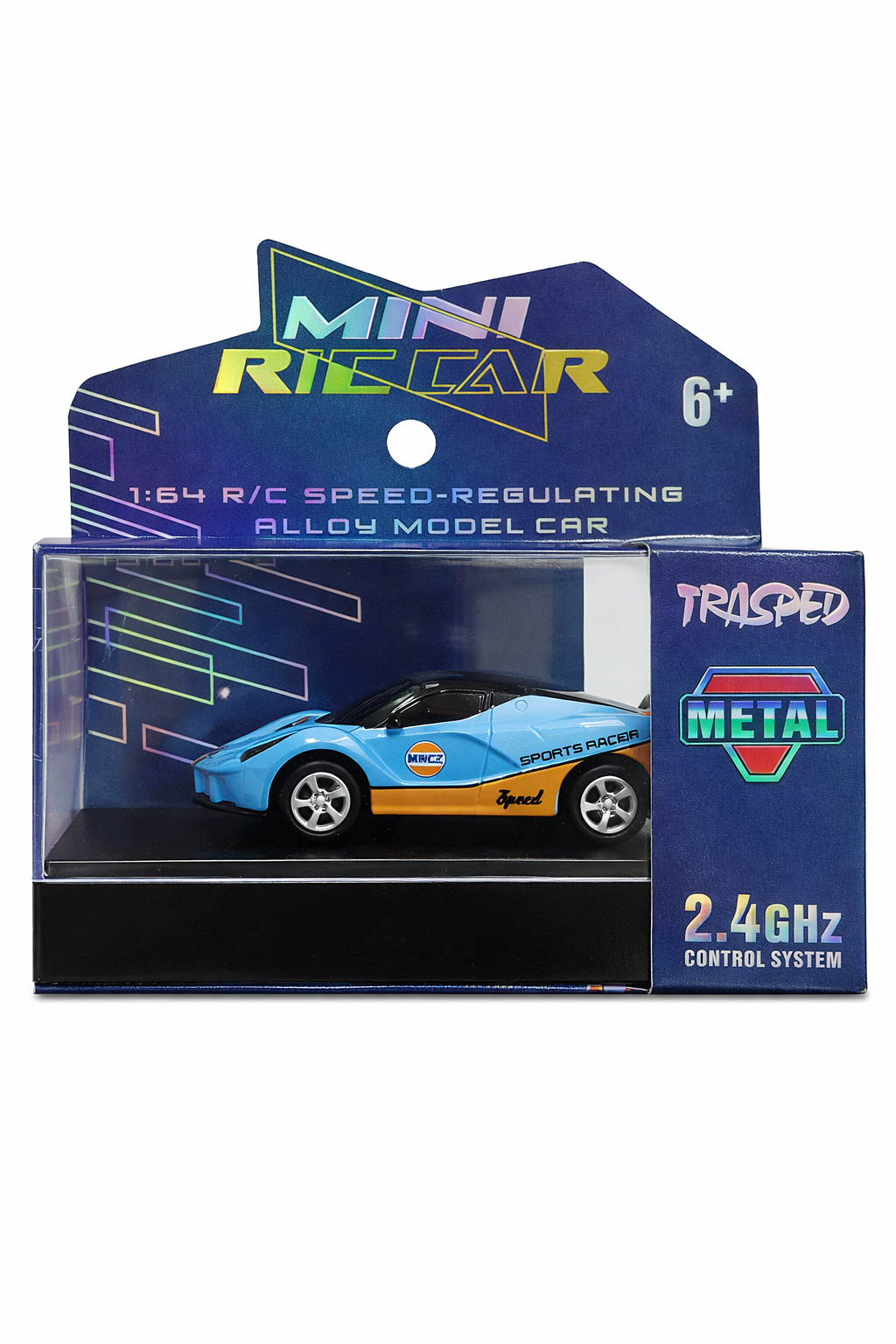 Ferrari-inspired mini RC supercar with bold blue & orange racing design.